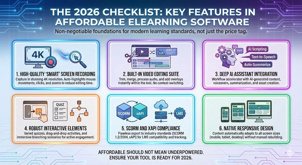 When you are shopping for affordable eLearning software, don’t just look at the price tag. You need to ensure the tool provides the technical foundation for modern learning standards. Here is what I consider non-negotiable in 2026: